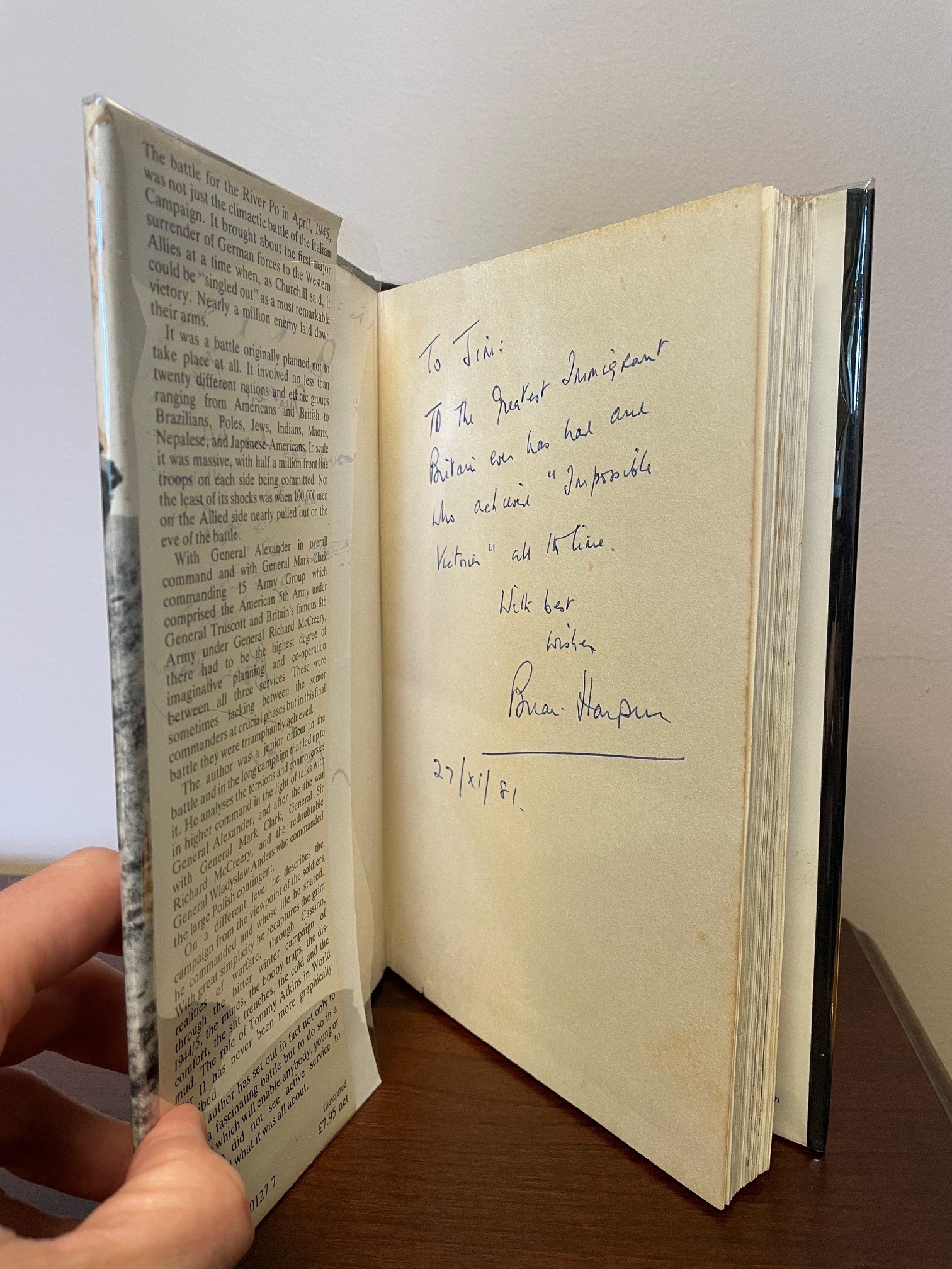 “The Impossible Victory: A Personal Account of the Battle for the River Po,” by Brian Harpur. William Kimber, London, 1980. Warmly inscribed by author to World War II fighter pilot ace James Goodson. Book is Very Good- with foxing to edges. Dust jacket is Near Fine. ($100.00)